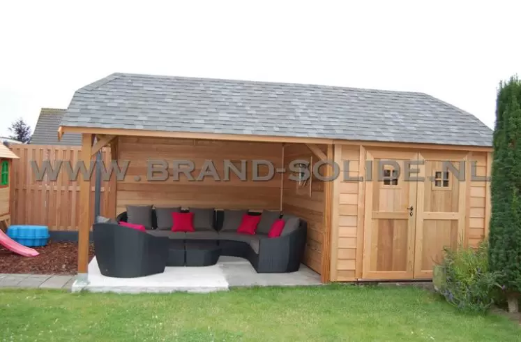 Exclusief en chique in onderhoudsarm CEDER. Bij deze opstelling is het tuinhuis 300 x 250 en de luifel 300 x 300. De wand onder de luifel is dubbelzijdig betimmerd zodat het regelwerk ertussen niet ziet. De wanden zijn gemaakt van Zweeds rabat /potdekselprofiel. De gelamineerde shingles geven een fraai kleureffect op het dak. Dit tuinhuis wordt geleverd in kant en klare wanden op een stevig regelwerk. Daardoor is het superstevig en relatief eenvoudig te monteren.