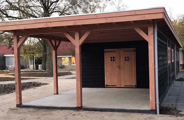 Douglas overkapping met plat dak in de afmeting 2.000 x 480 paalmaat.