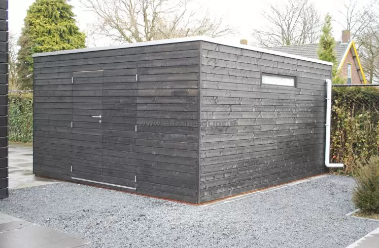 Strakke lijnen, modern design. Het afgebeelde tuinhuis is 400 x 400 met dubbele deur met vlakke planken in vuren