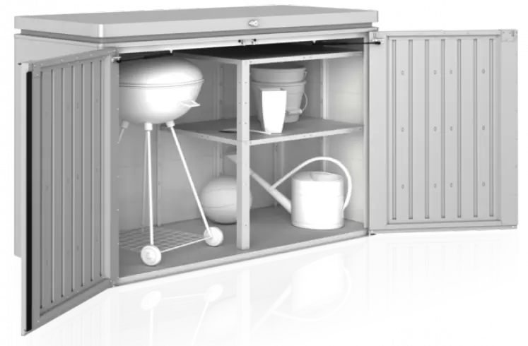 Slimme tuinkast van Biohort. Ideaal voor het opbergen tuinkussens, kinderspeelgoed en tuinspullen. Multifunctioneel omdat je zo wel het deksel met gasdrukveer als de dubbele deuren kunt openen. Oogstrelend design, onderhoudsvrij en 20 jaar garantie!