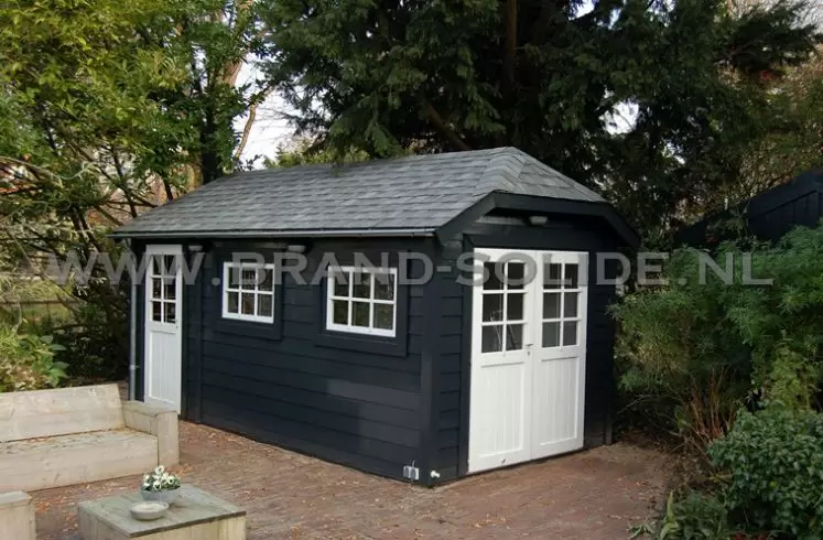 Exclusief en toch sfeervol op een mooi plekje. Deze klant koos voor een smal en lang model tuinhuis wat hier ook het mooist in het geheel is. Het tuinhuis is 250 x 500, heeft meerdere deuren en ramen (optie). De wanden zijn gemaakt van zweeds rabat /potdekselprofiel op regelwerk en gemaakt van onbehandeld vurenhout.De gelamineerde shingles geven een fraai kleureffect op het dak. Dit tuinhuis wordt geleverd in kant en klare wanden op een stevig regelwerk. Daardoor is het superstevig en relatief eenvoudig te monteren.