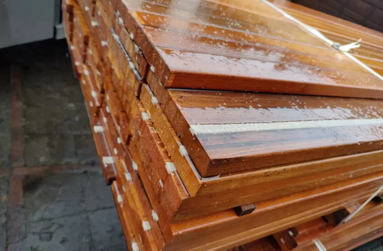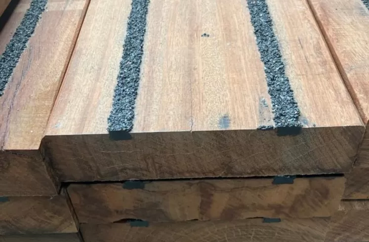 In een speciaal gefreesde groef wordt een slijtvast epoxy-materiaal gespoten, hierdoor wordt de strip opgesloten in de plank.