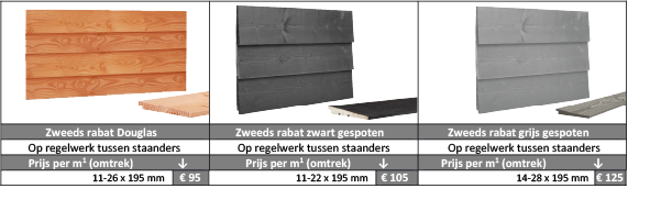 Prijs /m1 losse wand: | Zweeds rabat Douglas | Zweeds Rabat Zwart | Zweeds Rabat Grijs |