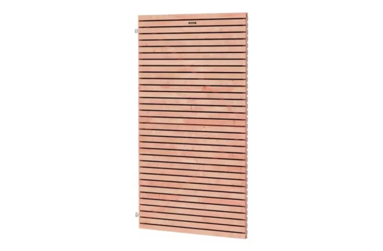 Deze schermen zijn gemaakt van Douglas latjes 13 x 44 met 1 cm tussenruimte.