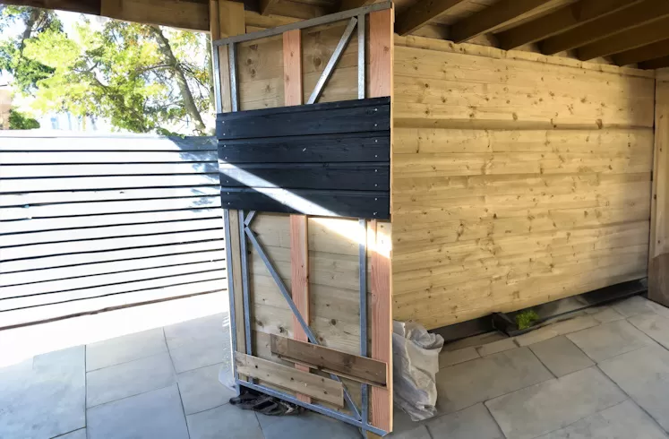 Onze stalen poortframes worden standaard inclusief ogen en duimen geleverd - wel zo makkelijk. U heeft ze namelijk toch nodig, bij anderen in de markt is het meestal noodzakelijk om deze bij te bestellen. Deze stalen frames zijn gemaakt om houten bekleding tegenaan te maken door middel van het gebruik van zelftappende schroeven. In het geval van een volledige dichte poort, is het soms verstandig om tussen het poortframe houten latten te gebruiken. Zo kunt u de bekleding makkelijker vastschroeven of zelfs nagelen, waardoor het extra strak en modern wordt.
